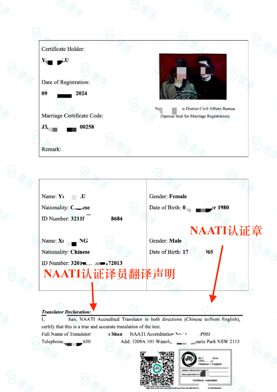 所有文件上都有NAATI翻译的盖章签字,是澳洲移民局、澳洲婚姻注册处认定的合法文件。您可以用我们的翻译件来移民、以及提交给有关政府机构。
