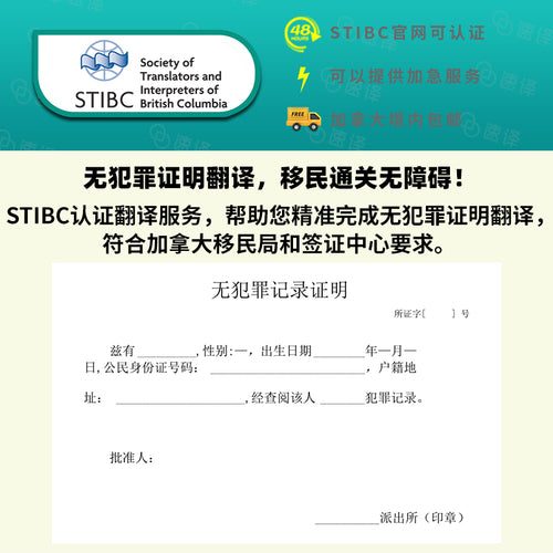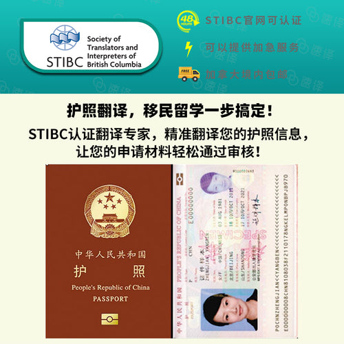 速译翻译提供加拿大BC省(卑诗省)STIBC(卑诗省翻译与传译认证协会)认证翻译服务,服务涵盖包括中国驾照、学历证明、户口本、结婚证等多种文件类型,满足移民申请、驾照转换、教育申请、法律事务等多种需求。