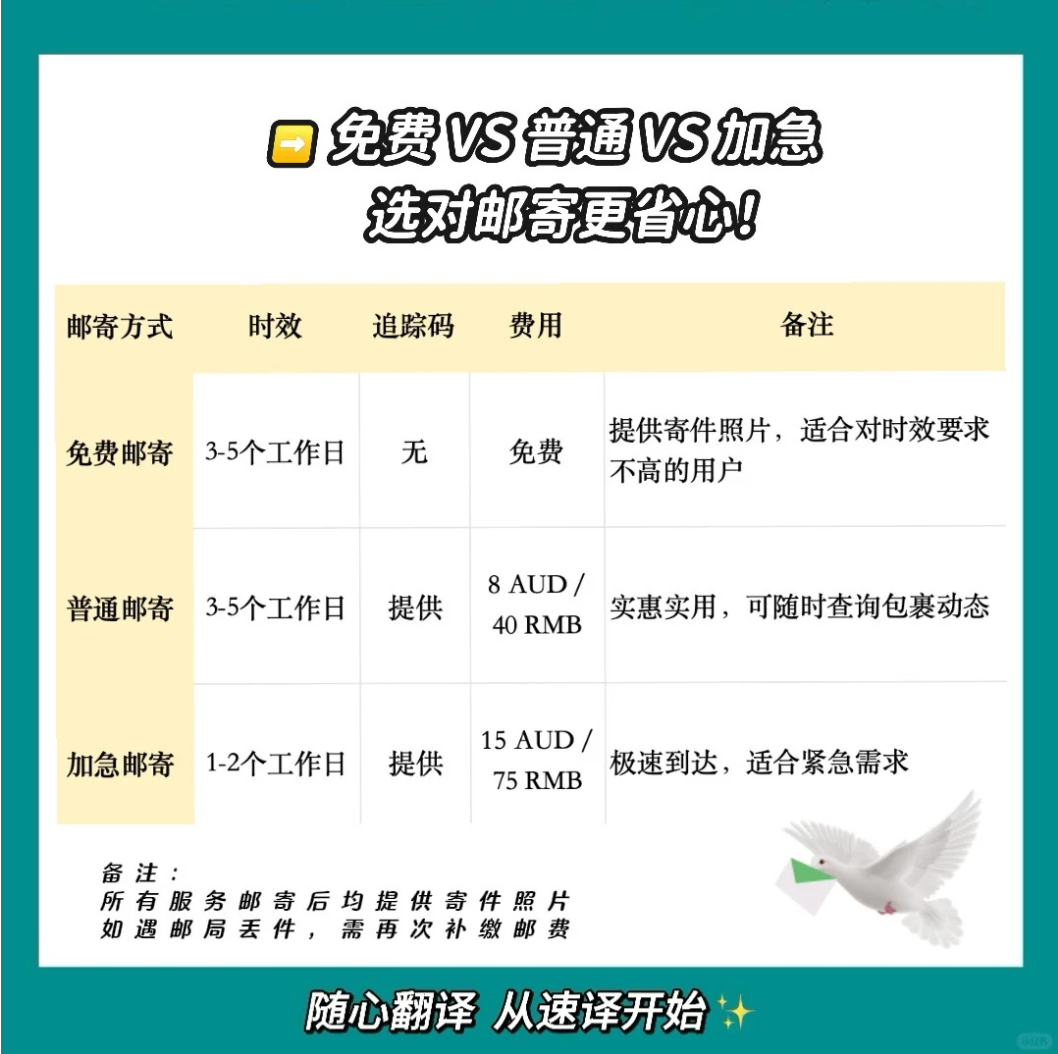 📍 所有文件均从悉尼发出,速译致力于为客户提供安全、准时的邮寄服务,确保翻译文件及时送达。服务: